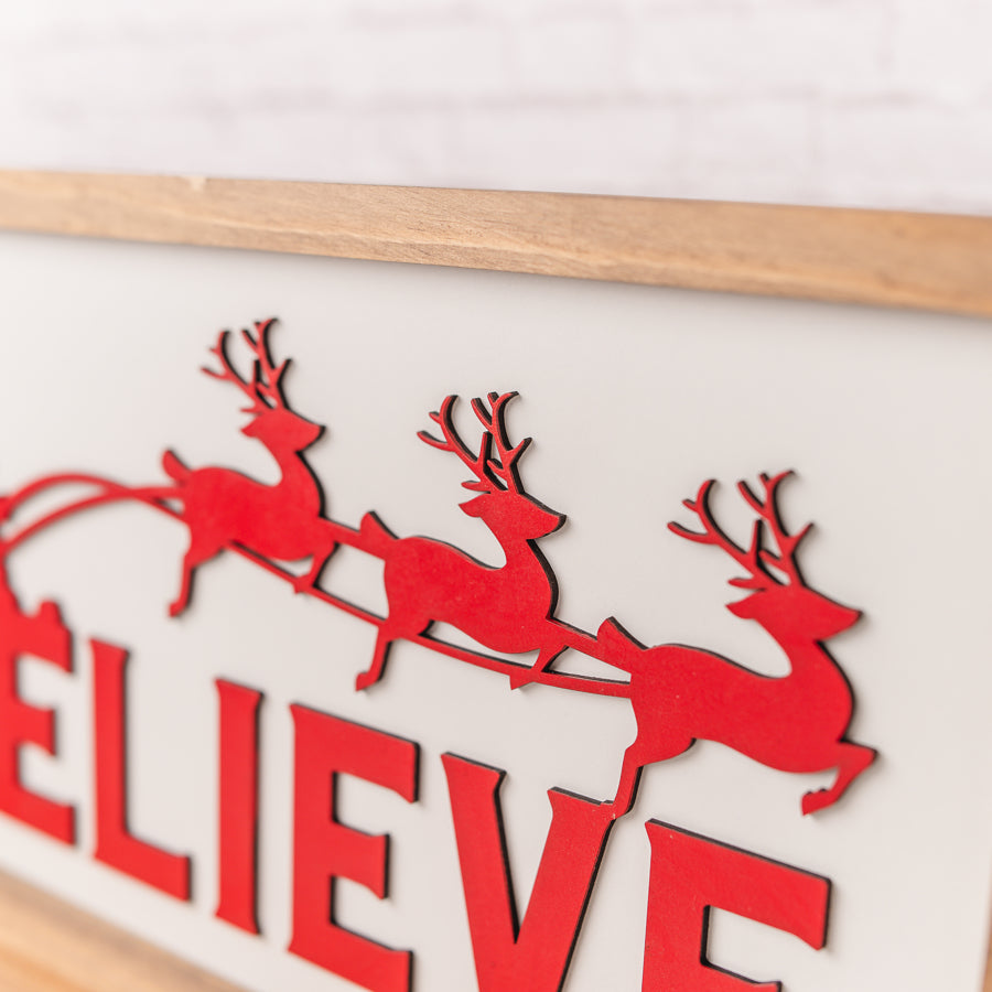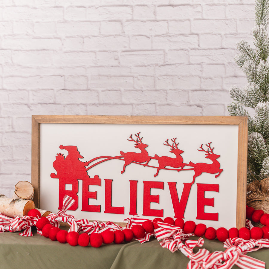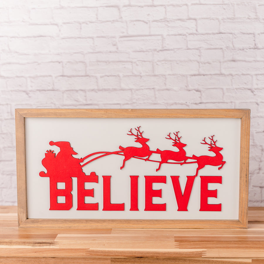 We love this sweet Christmas sign!  Pull it out during the holiday season to bring the magic of Christmas into your home!  It is an 11x21 sign with a weathered walnut stained frame.  Perfect to sit on your mantle, or hang on your wall.