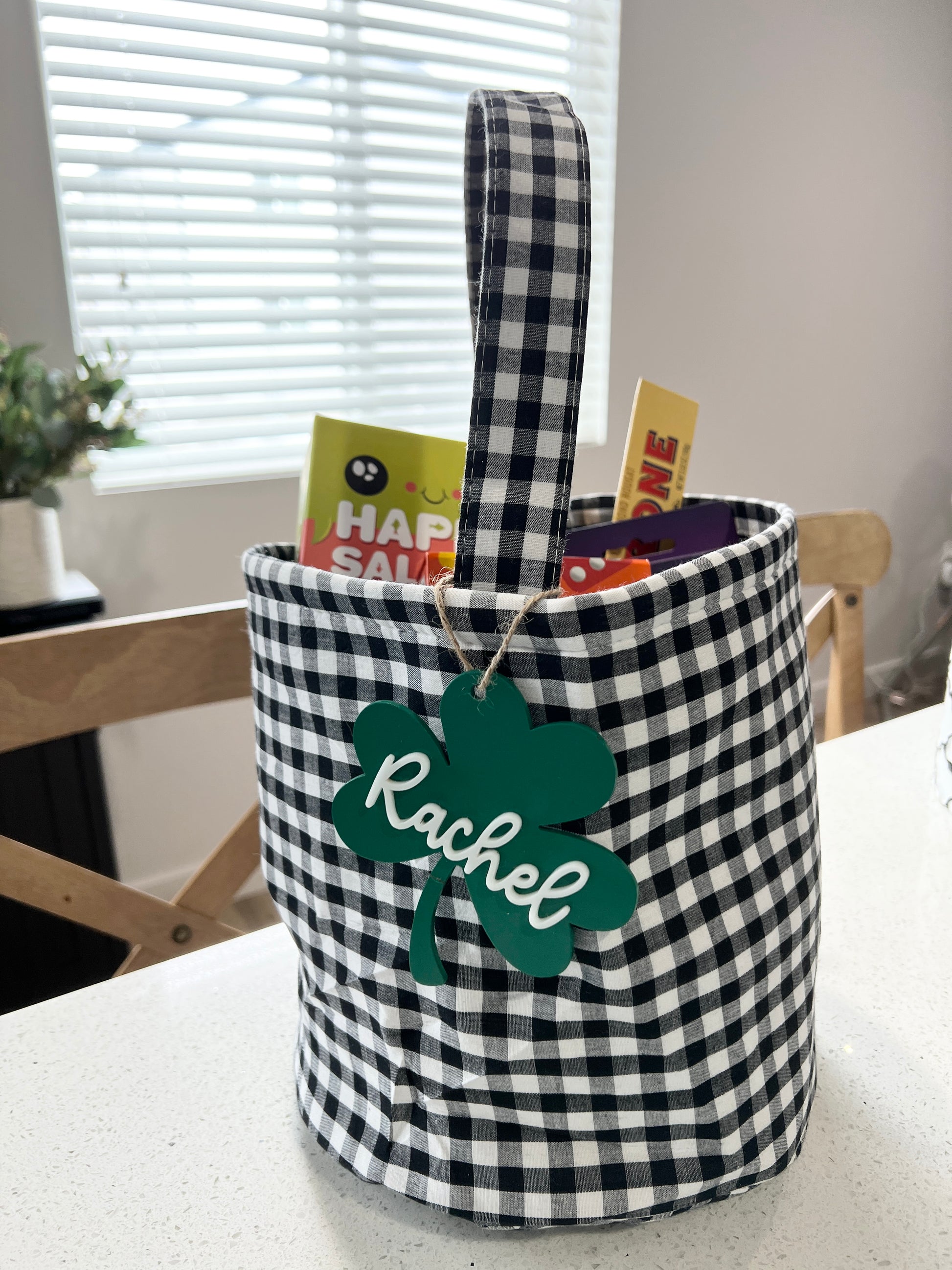 This product is 1 black and white gingham bag with 1 darling shamrock tag. These  tags have the CUTEST script font and are perfect for St. Patrick's Day!