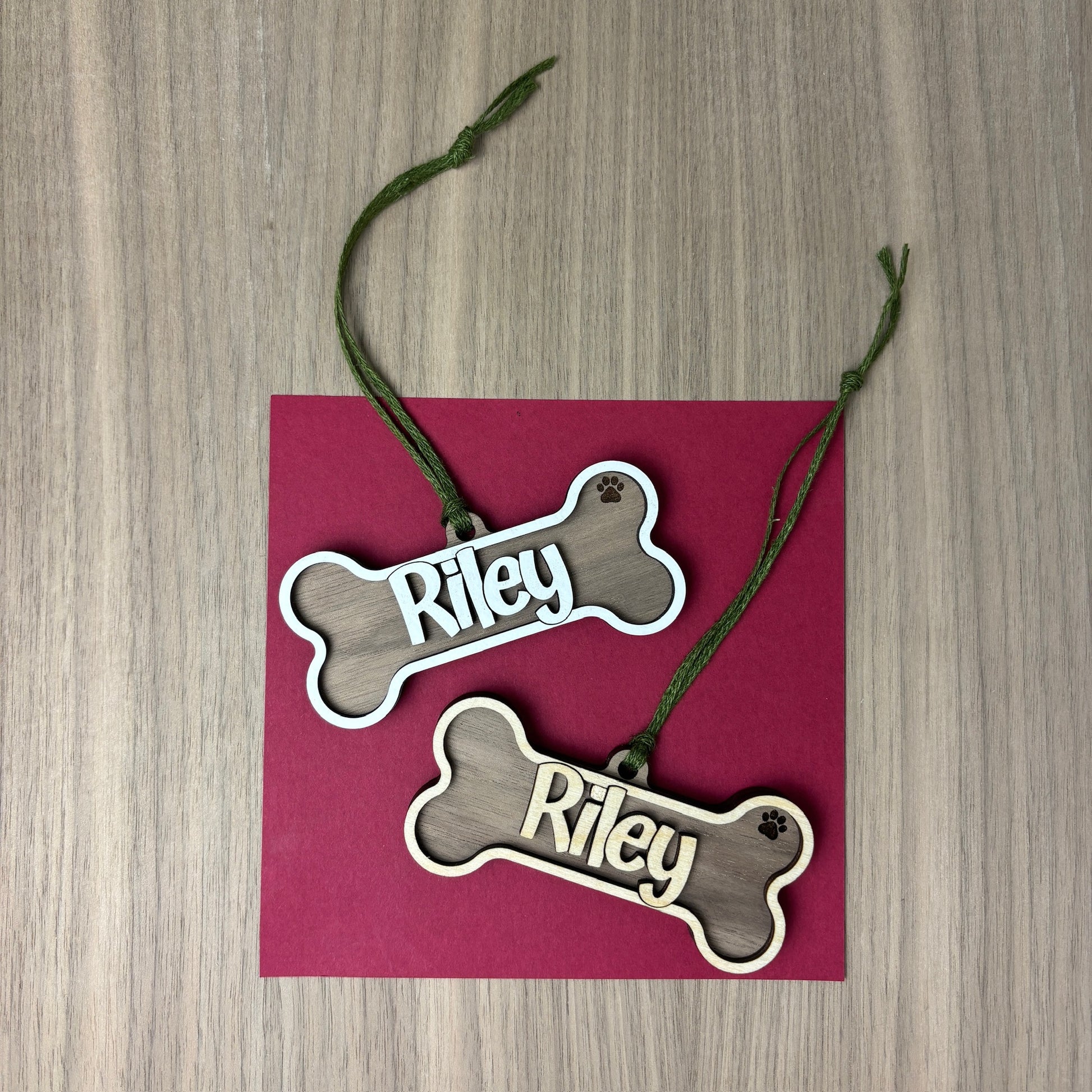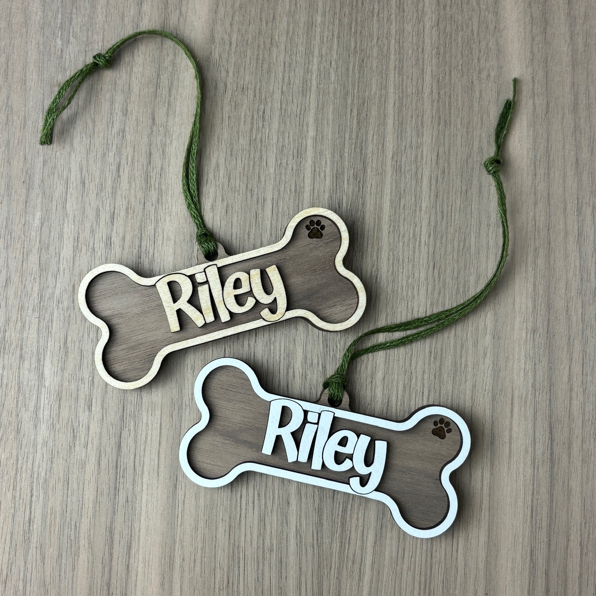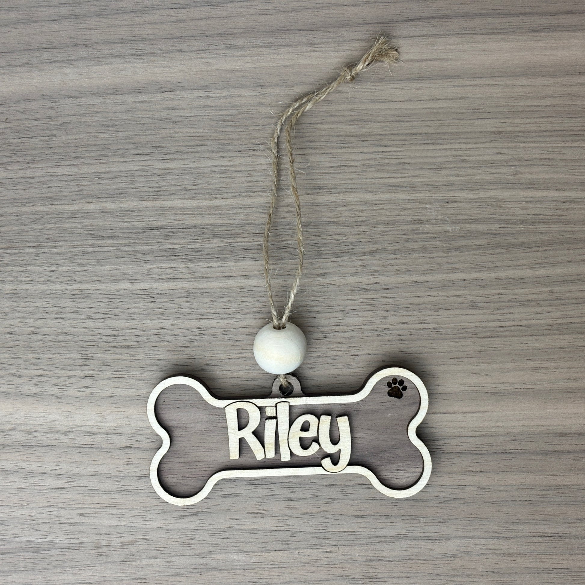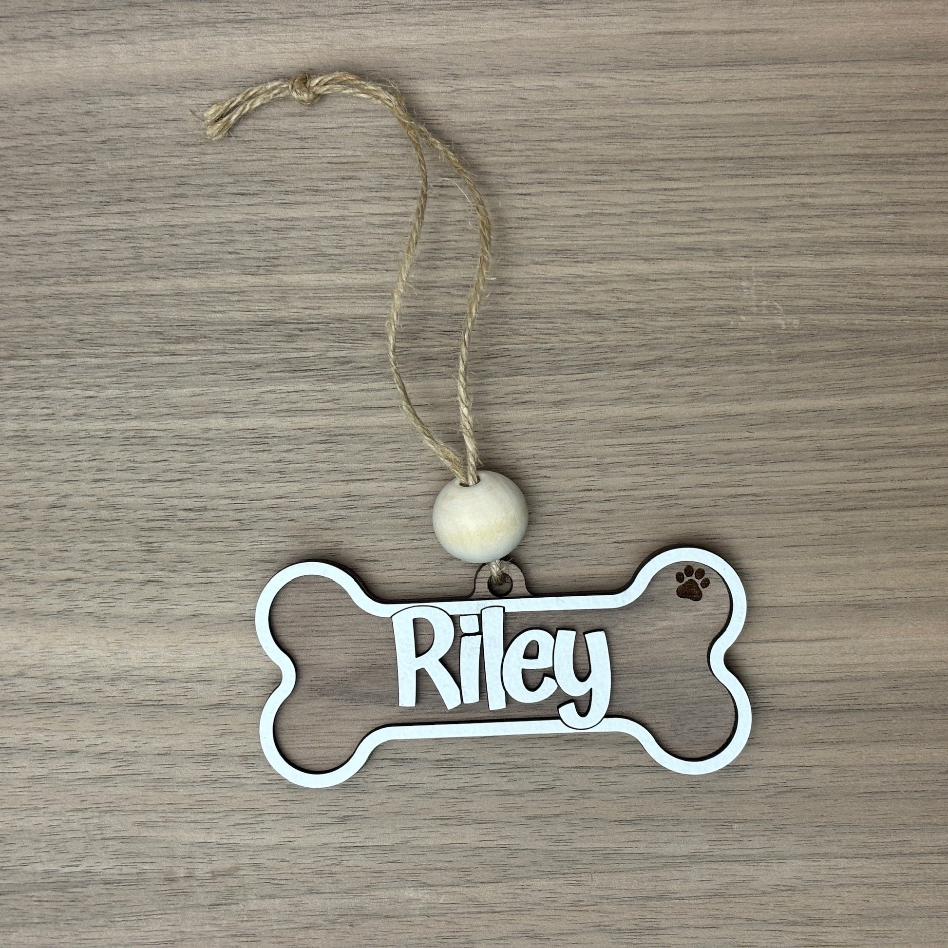 White or natural wood personalized dog name on top