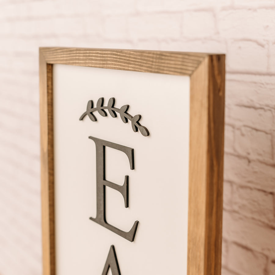 This simple and classy sign can easily hang in that vertical space in your kitchen. This 11x21 inch sign has a black 3D laser-cut design. The stain on the frame is Weathered Walnut.