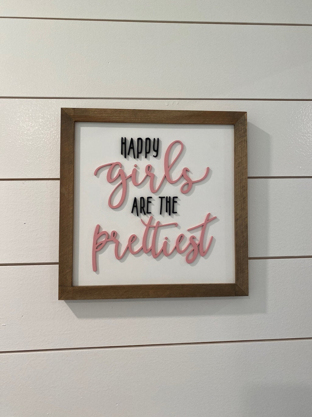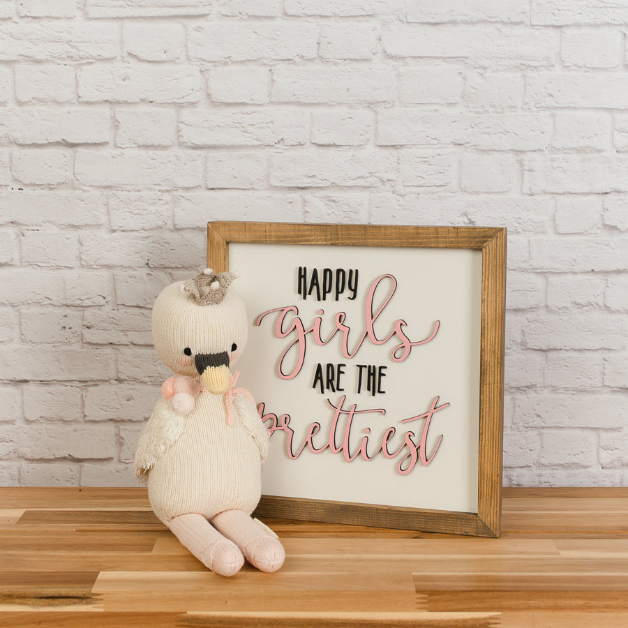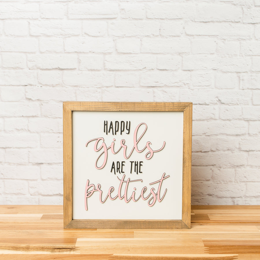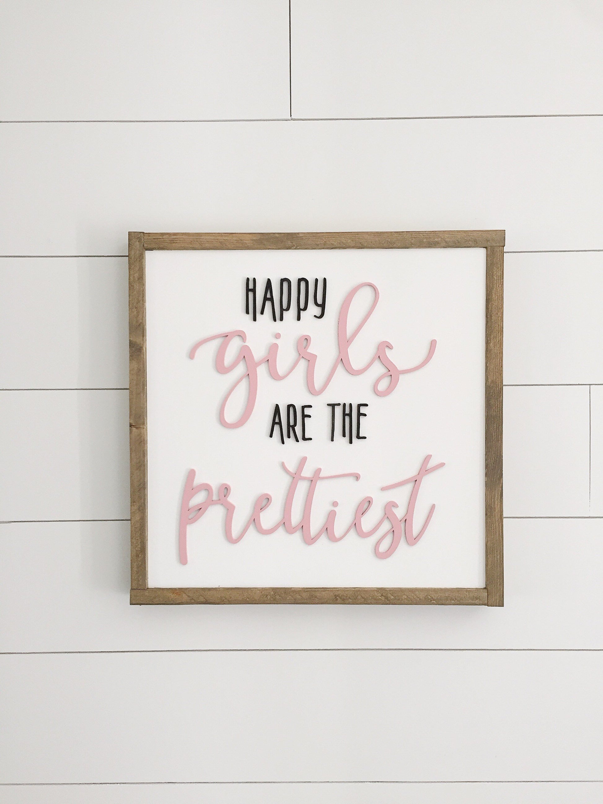 This sign features a famous quote by Audrey Hepburn: Happy Girls are the Prettiest. Isn't it true? A smile is the most beautiful make up. This sign is made with laser cut letters mounted on the background to give the sign a 3D look. This sign easily hangs by a sawtooth hanger on the back.