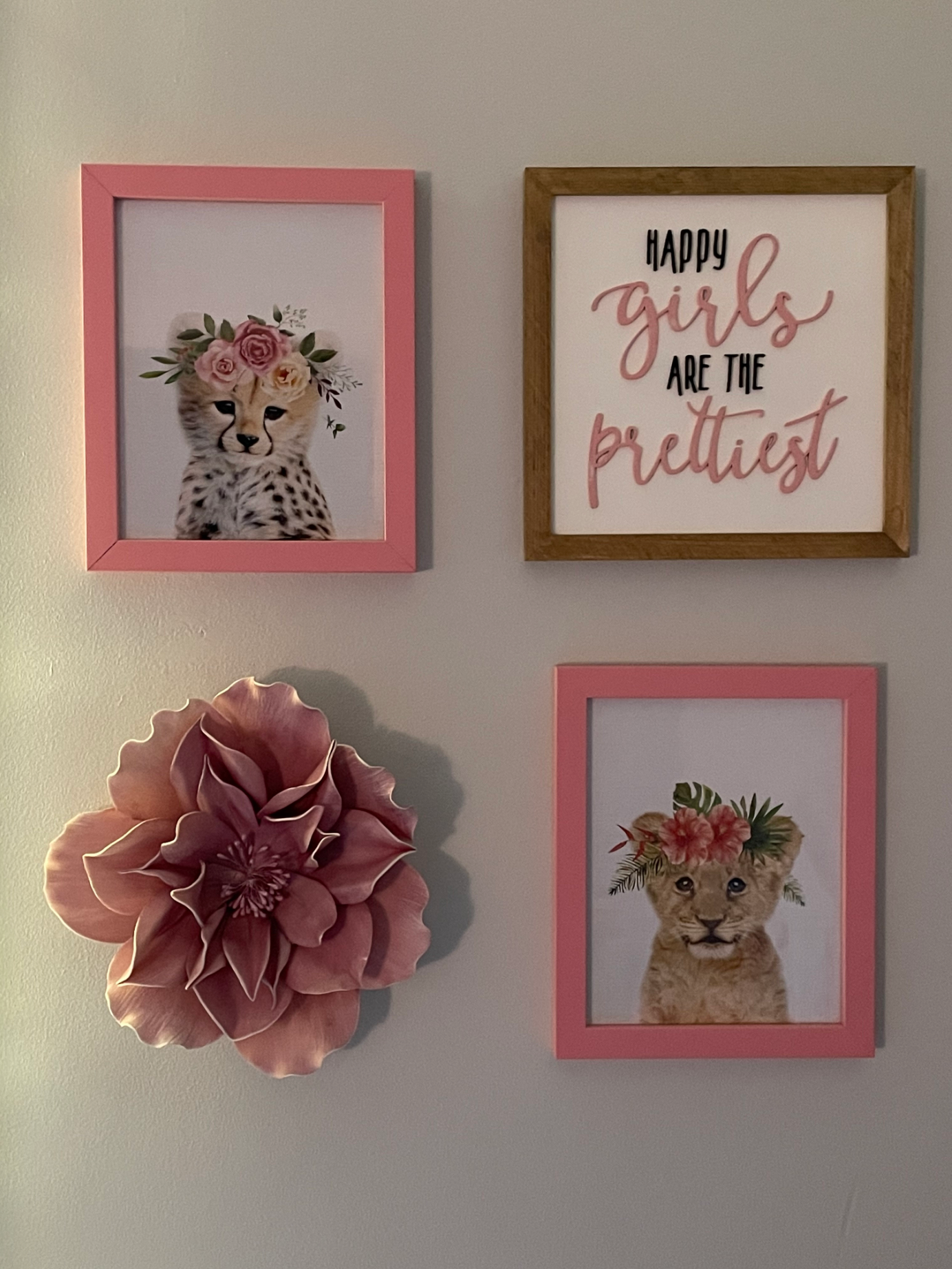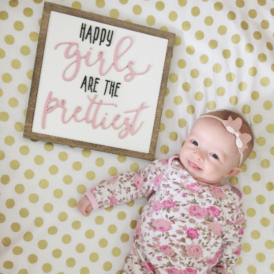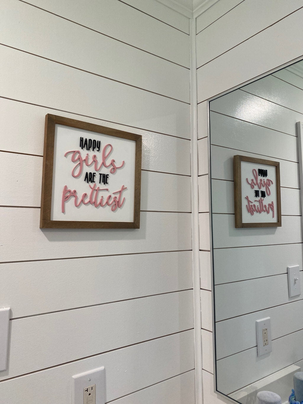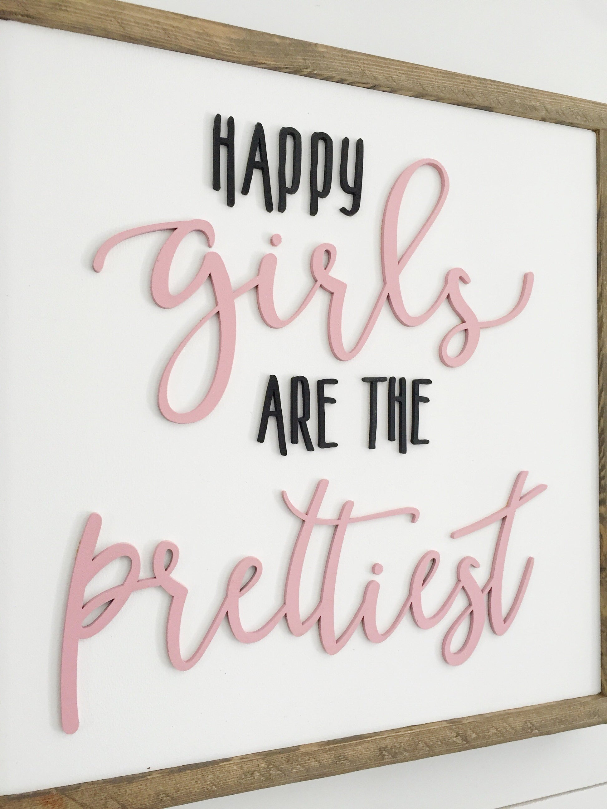 This sign features a famous quote by Audrey Hepburn: Happy Girls are the Prettiest. Isn't it true? A smile is the most beautiful make up. This sign is made with laser cut letters mounted on the background to give the sign a 3D look. This sign easily hangs by a sawtooth hanger on the back.