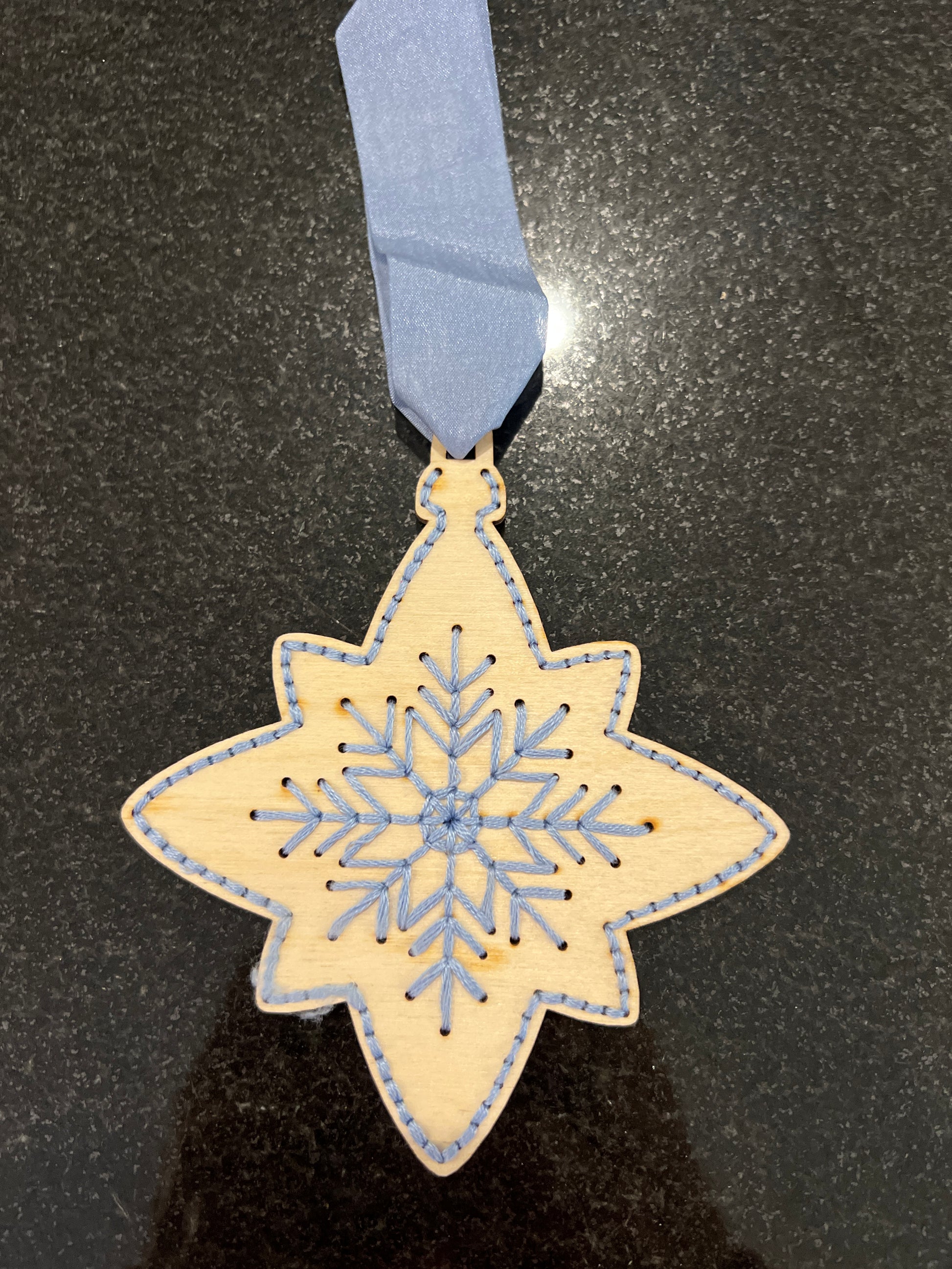 Kit includes laser cut ornament, blue embroidery floss, flosser to help thread the needle, needle and ribbon to hang along with instructions.
