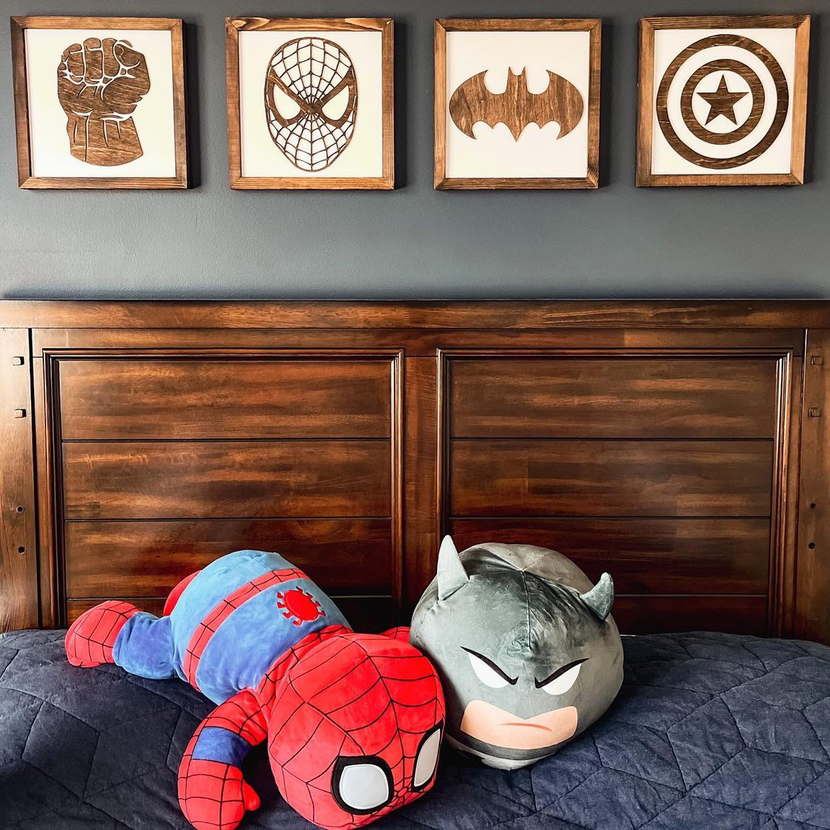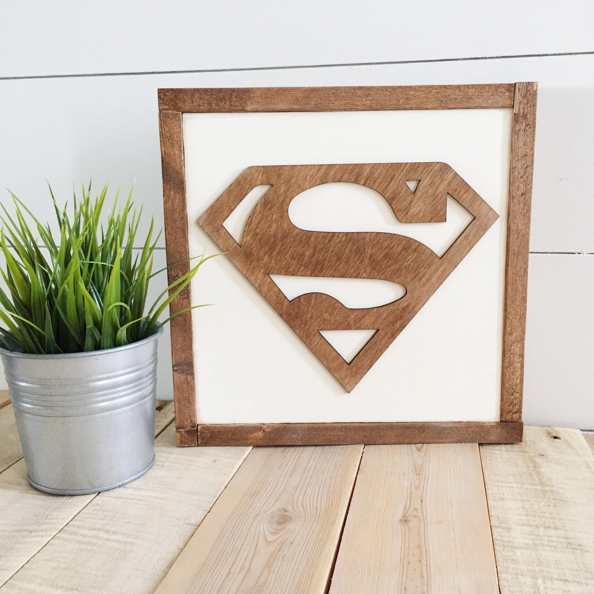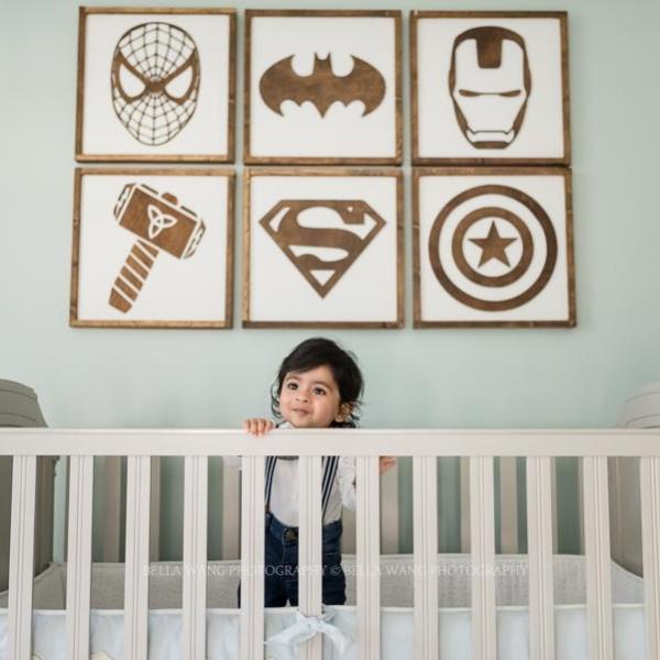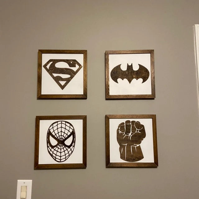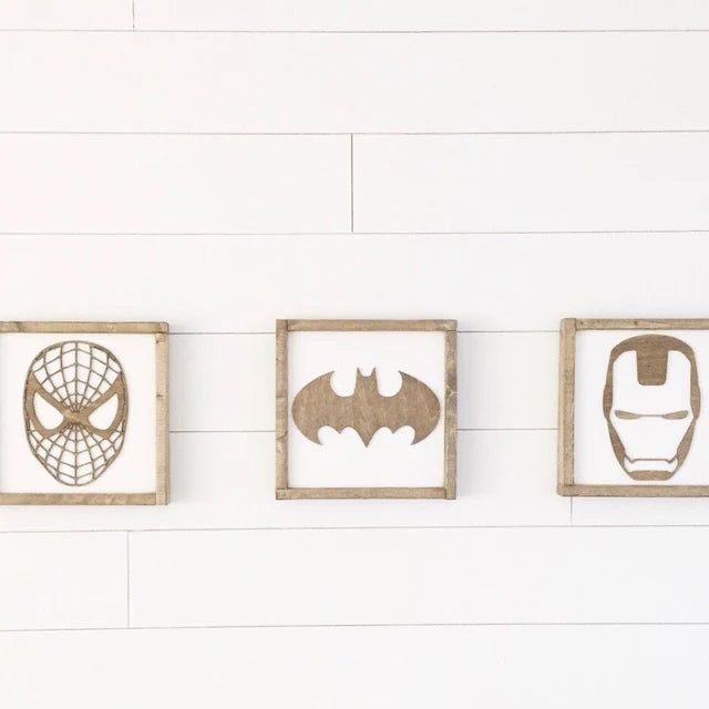 These unique superhero signs are perfect for the little (or big) superheroes in the family and mom who would prefer to keep a neutral color pallet! Each symbol is laser cut, stained, and attached to a white background. They are then framed with a wood frame with matching stain.