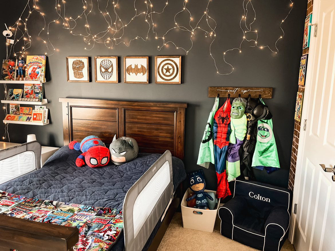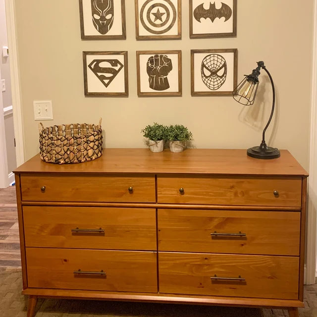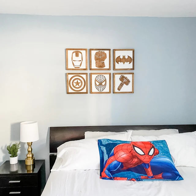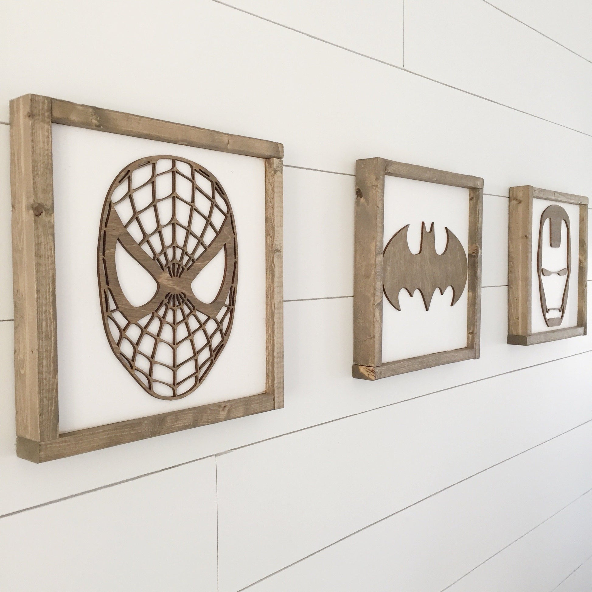 These unique superhero signs are perfect for the little (or big) superheroes in the family and mom who would prefer to keep a neutral color pallet! Each symbol is laser cut, stained, and attached to a white background. They are then framed with a wood frame with matching stain.