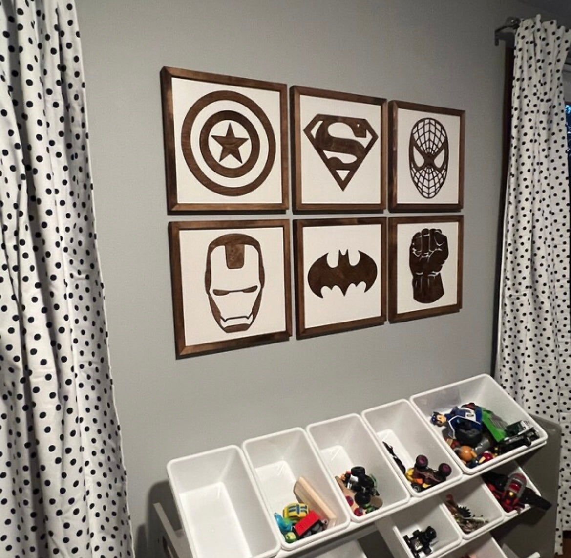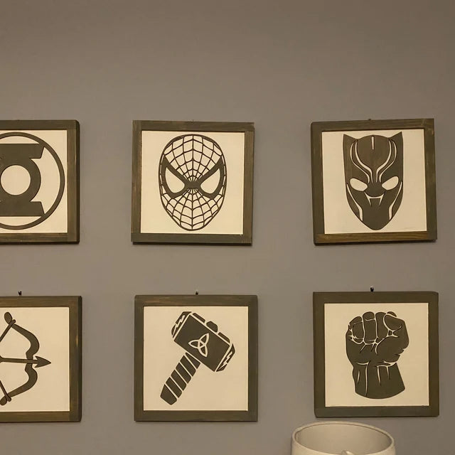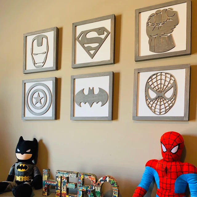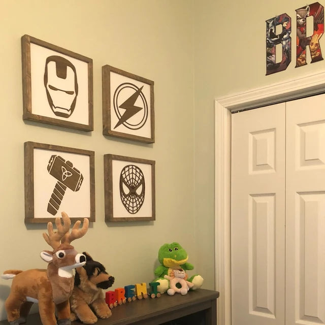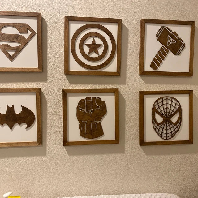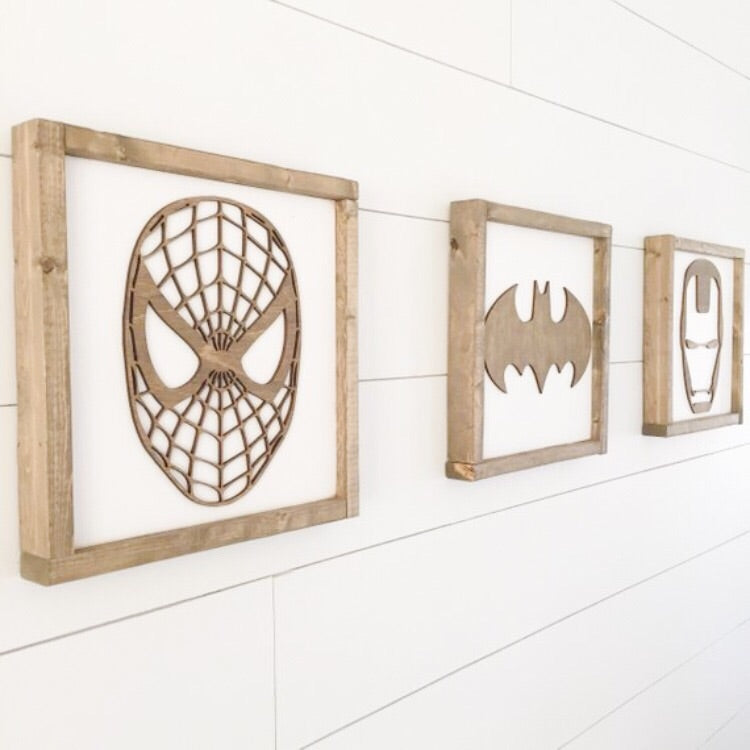 These unique superhero signs are perfect for the little (or big) superheroes in the family and mom who would prefer to keep a neutral color pallet! Each symbol is laser cut, stained, and attached to a white background. They are then framed with a wood frame with matching stain.