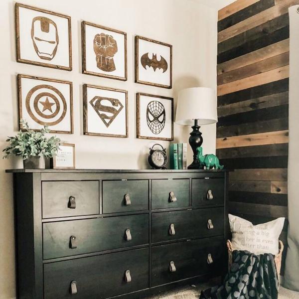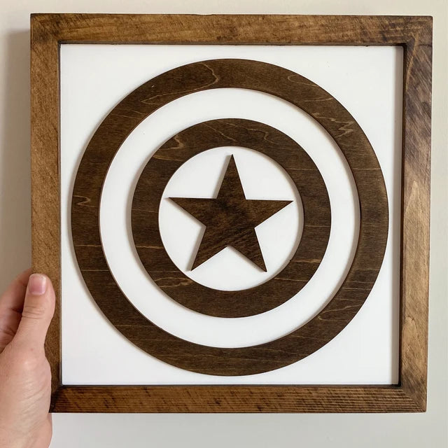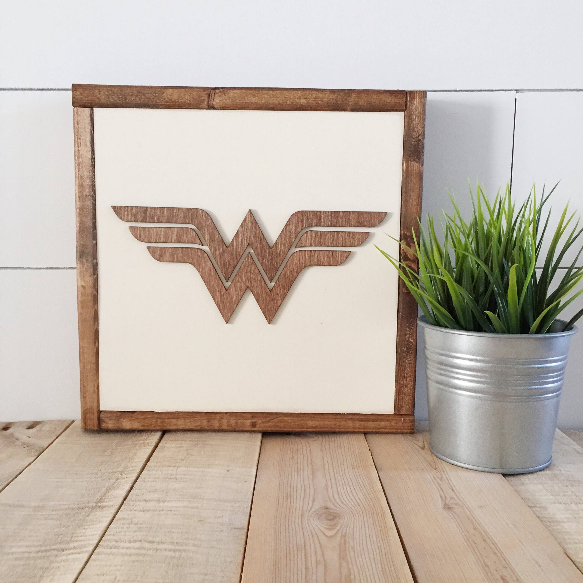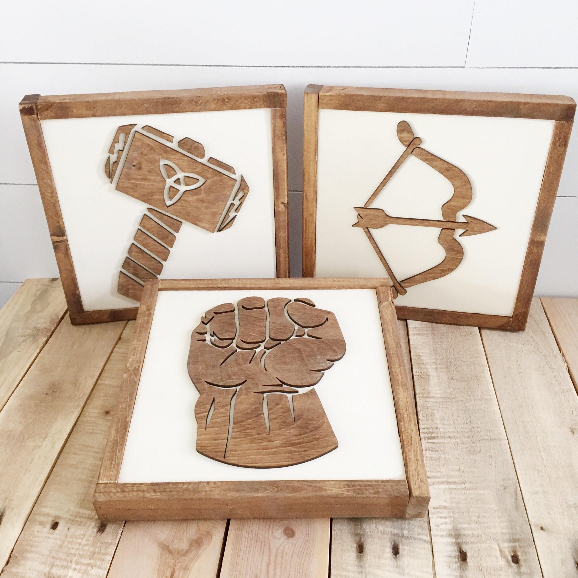 These unique superhero signs are perfect for the little (or big) superheroes in the family and mom who would prefer to keep a neutral color pallet! Each symbol is laser cut, stained, and attached to a white background. They are then framed with a wood frame with matching stain.